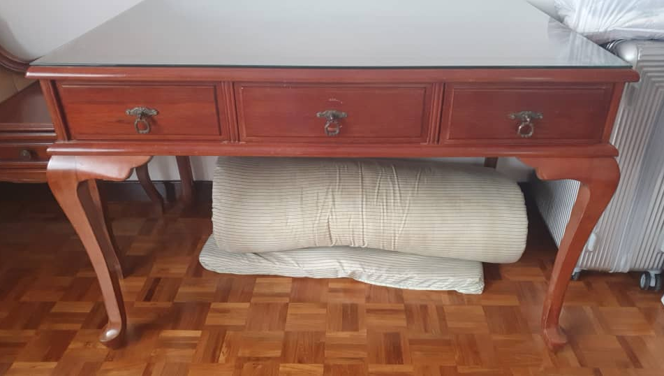 Glass Top Wooden Console Table with 3 Drawer Brown Colour / Meja Konsol Kayu Atas Kaca dengan Warna Coklat 3 Laci